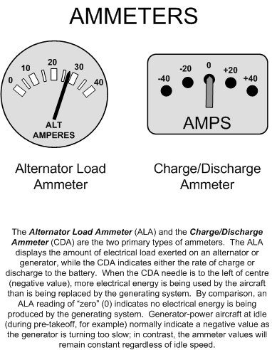 Two types of electrical monitoring instruments are the ammeter, which measures the rate of flow associated with the current being produced, and the voltmeter, which indicates the voltage in the system.  An ammeter should always indicate a reading that is greater than zero.