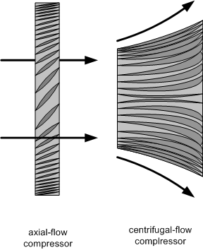 There are two types of compressor—the axial-flow compressor and the centrifugal-flow compressor.  The axial compressor is shaped like a multi-bladed fan (referred to as rotor blades).  Axial-flow compressors are the more efficient of the two, obtaining a compression ratio in excess of 25:1; this efficiency is derived primarily from the fact that the flow of air through axial-flow compressors essentially remains parallel to the longitudinal axis of the engine.  Axial-flow compressors, however, are less durable than centrifugal-flow compressors as the rotor blades are vulnerable to impact with ingested material.  In contrast, centrifugal-flow compressors essentially slingshot the air away from the longitudinal axis of the engine into what is referred to as the diffuser.  The diffuser is positioned just before the combustor and serves the function of slowing the velocity of the airflow, yet simultaneously increasing its air pressure.  The compression ratio of centrifugal-flow compressors is approximately 10:1.