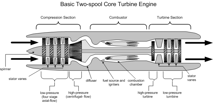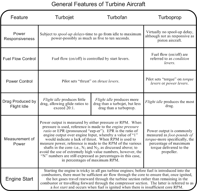 These basic components of turbine engines discussed above are associated with gas generator engines, core turbine engines, or turbojet engines—all basically the same type of engine.  In contrast, there are major structural changes in what are referred to as turbofan and turboprop.