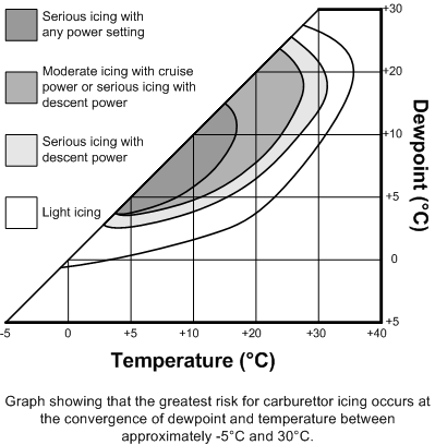 Carburettor icing is one of the most frequent causes of unexpected engine failure during flight.  An encounter with carburettor icing is most likely when in moist air conditions and between temperatures of -5 and 30°C.; a temperature of 15°C. presents the highest risk, but the Relative Humidity must be at least 50%.