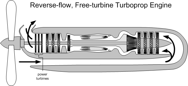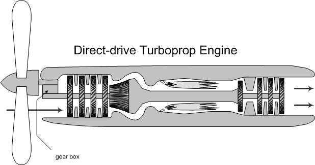There are two types of turboprop engine, the first is referred to as a direct-drive turboprop, and the second is a free-turbine turboprop.  With the direct-drive system, the propeller is connected to a shaft and turbine and the speed of the propeller is modified through a reduction gear mechanism; in the free-turbine system, the propeller is connected to what is referred to as a power turbine which “floats” in the high pressure exhaust gases in the turbine section.