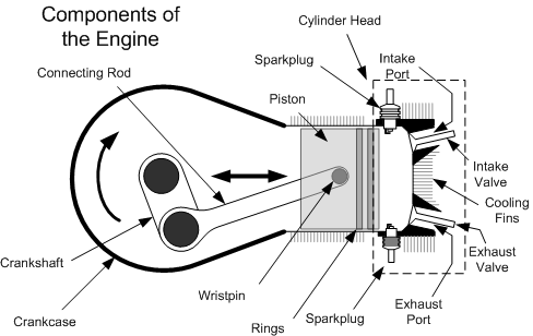 The shell of an engine is referred to as the crankcase; the crankcase has at its centre the crankshaft, which runs longitudinally through the crankcase and is connected to the propeller at the front end of the crankcase; affixed to the crankcase are the cylinders which contain the pistons; the piston move up and down in the cylinders and this movement, caused by the timed explosion of an air/gas mixture, is the source of engine power; the explosions in the cylinders are caused by the timed spark on the ends of the spark plugs;  the sparking of the spark plugs, in turn, is caused by the magnetos which are connected to the rear of the engine in what is referred to as the accessories box; as the pistons move up and down, the introduction and exhaust of the air/gas mixture is controlled by the timed opening and closing of valves located at the top or “head” of the cylinders; the timed movement of these valves is controlled by the camshaft which runs parallel to the crankshaft inside the crankcase; between the valves and the camshaft is a valve-operating mechanism; the pistons are connected to the crankcase by connecting rods; and the mixture of the air/gas mixture prior to entry into the cylinders is an induction system—usually a carburettor or fuel injection system; between the carburettor and the cylinders in the intake manifold, and as spent gases exit the cylinders they pass into the exhaust manifold and out the exhaust pipe.
