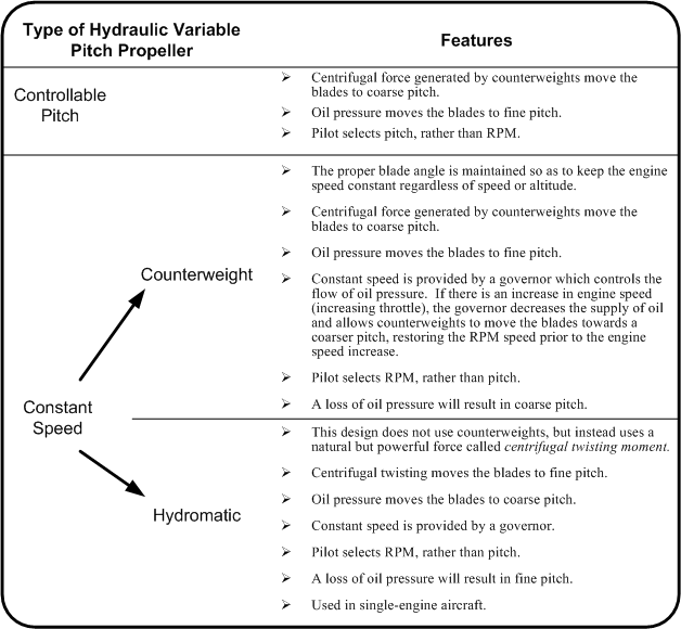 To follow this rather complicated nomenclature further, hydraulic variable pitch propellers incorporate one of three designs: controllable pitch, constant speed or hydromatic constant speed.  All of these incorporate a hydraulically operated cylinder that pulls or pushes a cam connected to a gear system that operates the blades (similar to a screwdriver turning a screw).