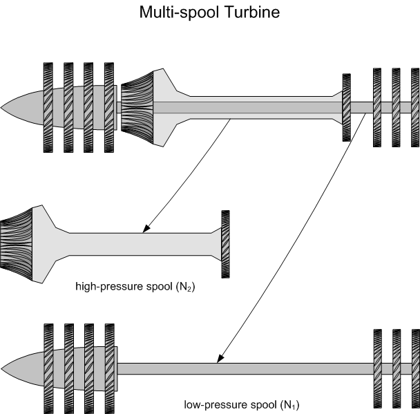 In contrast, the term multispool engine refers to turbine engines where there is more than one shaft running though the core, each shaft having it own independent set of compressors and turbines that turn at different speeds.  The term spool denotes the compressor, the turbine, and the shaft that connects the two.  Where two shafts exist—known as dual-compressor engines—the first compressor (most forward in the engine) is referred to as the low-pressure compressor, and it is driven by the most reward turbine.  The speed at which this compressor turns is known as N1.  The second compressor in the dual-compressor engine is referred to as the high-pressure compressor; it is connected to the high-pressure turbine, and the speed of its rotation is N2.