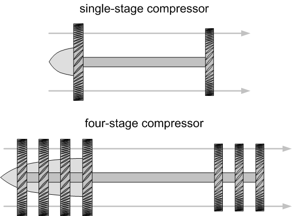 A turbine typically has a series of compressor wheels mounted on a single shaft, and each wheel or fan is referred to as a stage (a “stage” includes the compressor wheel and the fixed stator vanes which position the flow for the subsequent compressor wheel).  Each stage increases the compression of the airflow—what is referred to as a multistage compressor.