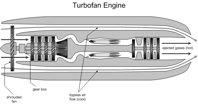 In the turbofan engine the shrouded fan is essentially a multi-blade propeller that is tightly fitted and enclosed in the front of the engine nacelle.  The shrouded fan accelerates a much larger volume of air than a turbojet engine, a portion of which does not enter the engine core, but instead passes outside and around the core, to mix at the end of the engine with the hot gases that exit the turbines.  The turbofan therefore produces bypass air which provides two important functions: firstly, the shrouded fan produces effective thrust, especially at low altitudes and airspeeds, and, secondly, the shrouded fan effectively muffles the ripping sound of the hot blast exiting the turbine core (turbofan engines are therefore much quieter than turbojet engines).  A high-bypass turbofan engine is one in which the fan moves a much as four-times the volume of air that moves though the core engine; in contrast, with a low-bypass turbofan engine, the volume of air moving through the fan is approximately equal to the volume of air moving though the core engine.