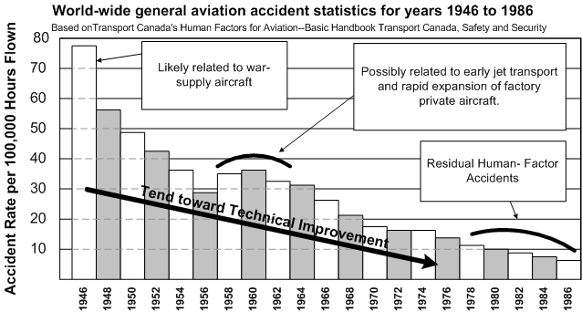 Statistics demonstrate improvement in safety—at least this is the general trend based on records kept since World War II. In 2001, the Canadian accident rate was 7.6 accidents per 100,000 hours flown, and less than 2 fatal accidents per 100,000 hours flown.2 Transport Canada reported for 2001 that there were 167 private aeroplane accidents in Canada, with 17 of these accidents involving fatalities.3 Pilots are generally considered to be the “cause” or “factor” in 84% of all accidents; in fatal accidents, pilot-related cause increases to 90.6%.4