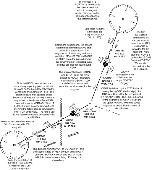 The radio aid, distance and course data for the airway V112 between Calgary VORTAC and Cranbrook VOR is examined in detail below. Note that the actual distances between symbols are only approximated for the sake of clarity.